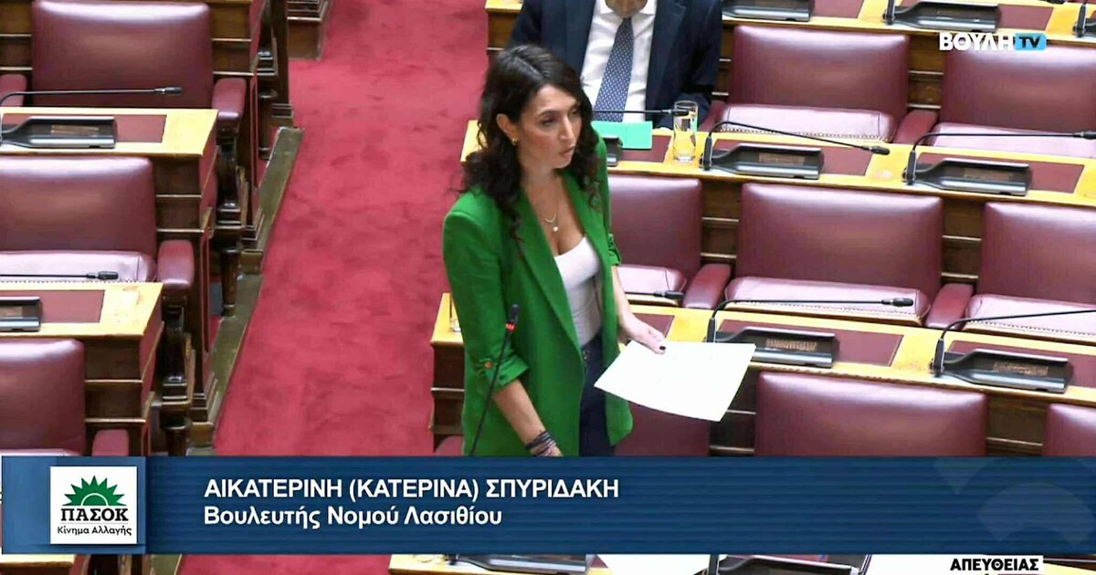Στη Βουλή επανέφερε για πολλοστή φορά η Βουλευτής Λασιθίου του ΠΑΣΟΚ, Κατερίνα Σπυριδάκη, το μείζον ζήτημα της λειψυδρίας στην Ιεράπετρα με Επίκαιρη Ερώτηση υπό το φως της διακοπής των εργασιών στο έργο “Νέος Αγωγός Μύρτου – Φράγμα Μπραμιανών”, ασκώντας έντονη κριτική στον Υφυπουργό Υποδομών και Μεταφορών, Νίκο Ταχιάο, για τις παρατεταμένες καθυστερήσεις, τις αλληλοκαλύψεις ευθυνών και την απουσία συντονισμού ανάμεσα στα αρμόδια Υπουργεία.