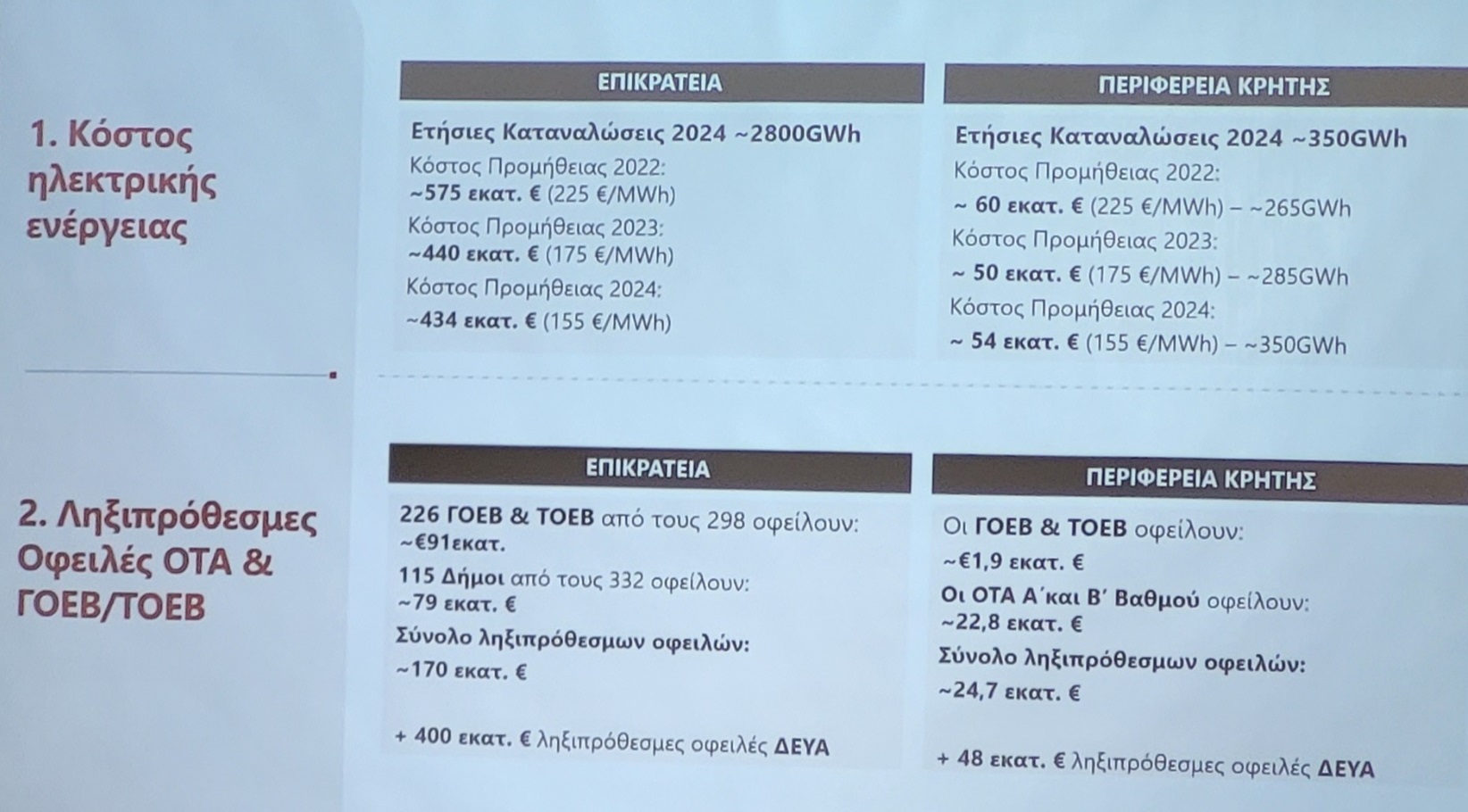 Παρουσίασε, μάλιστα, στοιχεία σύμφωνα με τα οποία οι ΟΤΑ της Κρήτης το 2022 πλήρωσαν για το ρεύμα 60 εκατ. ευρώ (τιμή μεγαβατώρας 225 ευρώ) το 2023 με τιμή 175 ευρω ανα μεγαβατώρα και το 2014 50 εκ. ευρώ με τιμή 155 ευρώ ανά μεγαβατώρα.
