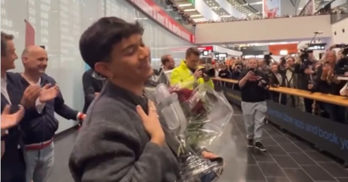Ο 24χρονος τενόρος εμφανίστηκε χαμογελαστός, κρατώντας ένα μπουκέτο με κόκκινα τριαντάφυλλα και το τρόπαιο της Eurovision στα χέρια του, ενώ κατέβαινε από το αεροπλάνο μέσα σε κλίμα ενθουσιασμού.