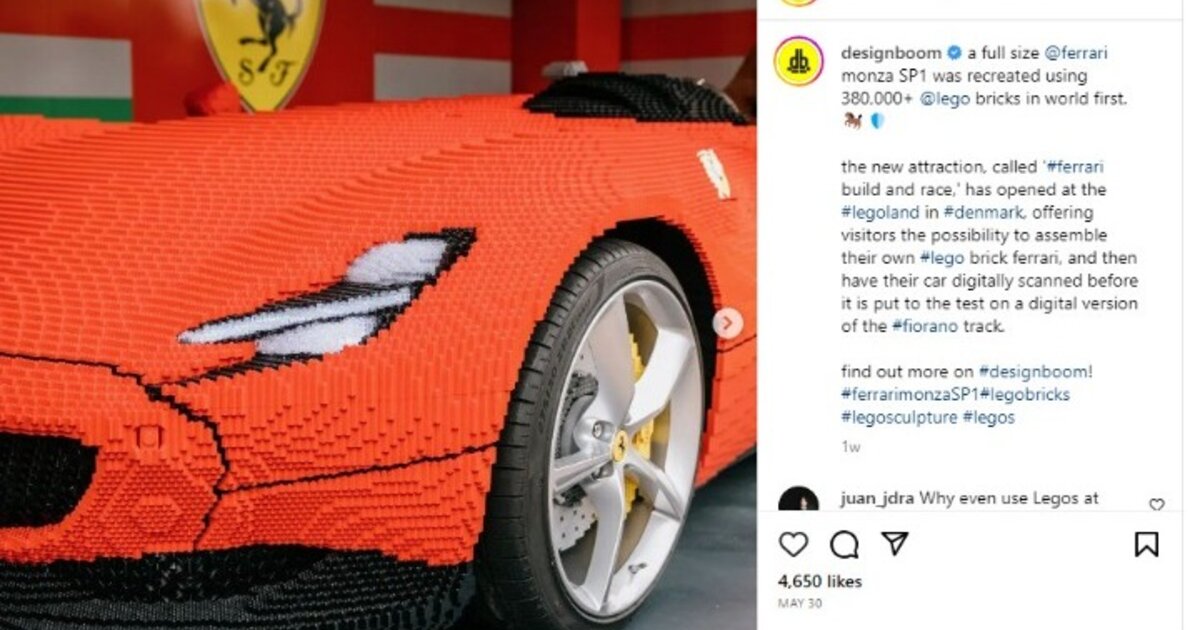 Μια σε φυσικό μέγεθος Ferrari Monza SP1 εκτίθεται στη LEGOLAND Billund στη Δανία· με 383.610 κυβάκια της γνωστής δανέζικης εταιρείας παιχνιδιών, το αντίγραφο που ζυγίζει 1.340 κιλά αιχμαλωτίζει διεξοδικά τις λεπτομέρειες της όψης του αγωνιστικού πρωτοτύπου.
