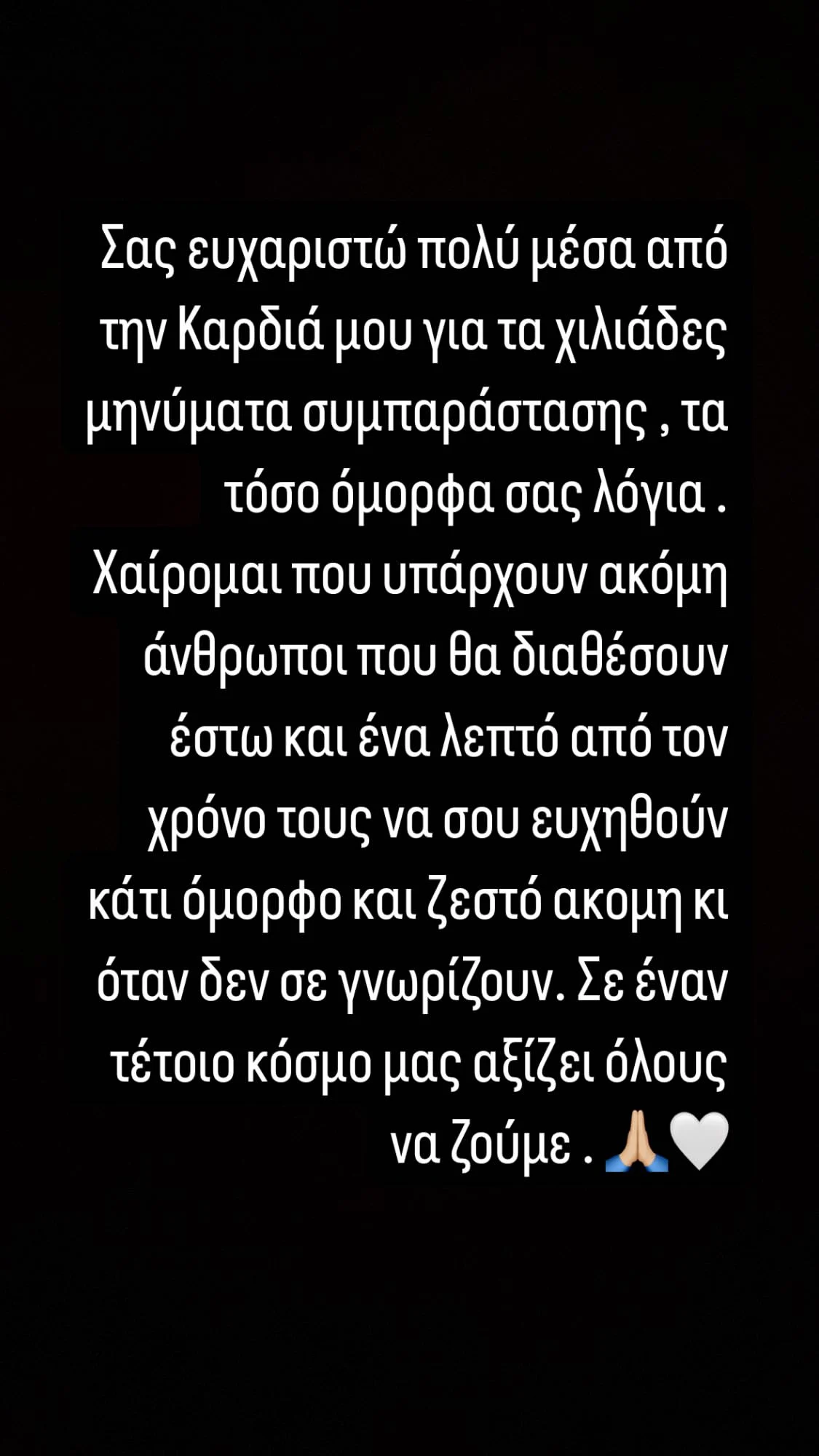 Συγκεκριμένα, η Μαρία Αντωνά σε κείμενο που δημοσίευσε στο προφίλ της στο Instagram, με την μορφή του story, έγραψε: «Σας ευχαριστώ πολύ μέσα από την καρδιά μου για τα χιλιάδες μηνύματα συμπαράστασης, τα τόσο όμορφά σας λόγια.