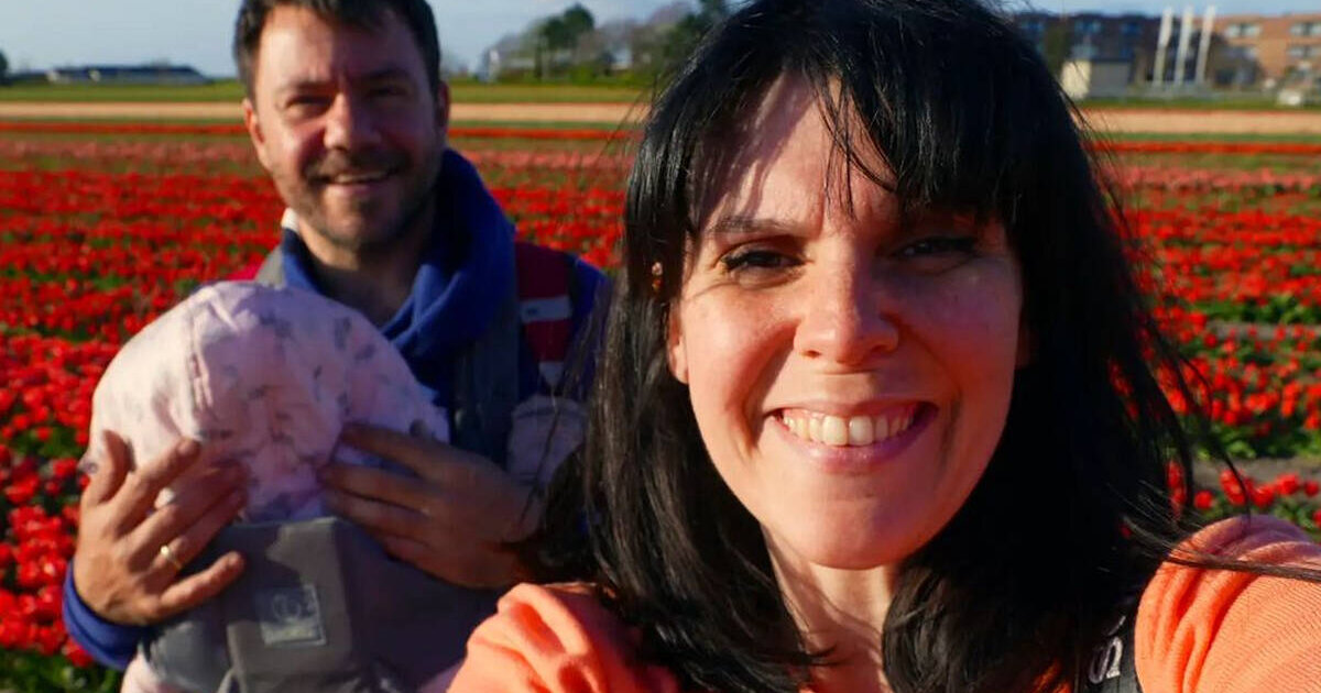 Οι δυο γονείς έχουν τις κόρες τους σε μάρσιππο και ποζάρουν δίπλα στις αποσκευές τους οι οποίες δεν είναι και λίγες, όπως σχολίασε χιουμοριστικά και ο Ευτύχης Μπλέτσας.