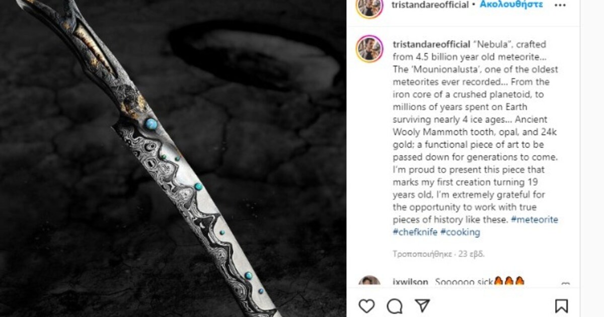 Ο 19χρονος κατασκευαστής σουγιάδων Tristan Dare έχει ήδη κάνει όνομα: εδώ και πέντε χρόνια κατασκευάζει σουγιάδες οι οποίοι είναι πραγματικά έργα τέχνης και συχνά ενσωματώνει στους σουγιάδες του παλιά υλικά. Το τελευταίο έργο του, που ακούει στο όνομα «Nebula», φιλοτεχνήθηκε από έναν από τους πιο παλιούς μετεωρίτες· εκτιμάται ότι είναι ηλικίας 4,5 δισεκατομμυρίων ετών.