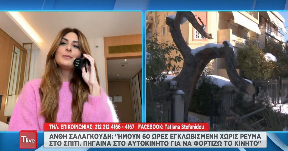Η Ανθή Σαλαγκούδη μιλά στο «Tlive» για τα όσα πέρασε κατά τη διάρκεια της κακοκαιρίας. Όπως είπε, ήταν 60 ώρες χωρίς ρεύμα στο σπίτι, ενώ φόρτιζε το κινητό της τηλέφωνο στο αυτοκίνητο.