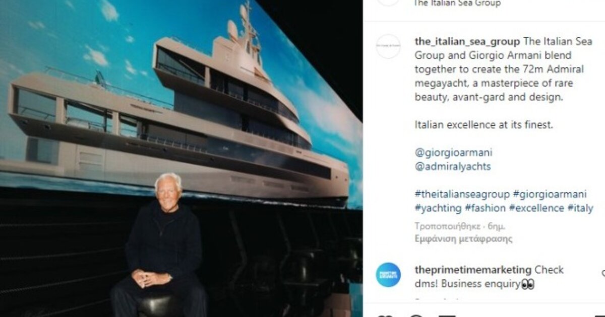 H πολυτέλεια στη θάλασσα είναι στο μυαλό του Τζόρτζιο Αρμάνι, καθώς σχεδιάζει το 72 μέτρων σούπεργιοτ Admiral για λογαριασμό του The Italian Sea Group· ο εσωτερικός σχεδιασμός του Admiral, η καθέλκυση του οποίου προγραμματίζεται για το 2024, παρουσιάστηκε στις 11 Φεβρουαρίου στη Marina di Carrara.