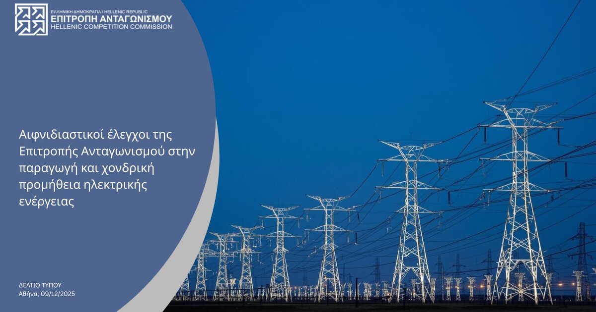 Σε αιφνίδιους επιτόπιους ελέγχους σε επιχειρήσεις του κλάδου παραγωγής και χονδρικής προμήθειας ηλεκτρικής ενέργειας προχώρησε η Επιτροπή Ανταγωνισμού, στο πλαίσιο ευρείας αυτεπάγγελτης έρευνας για πιθανές αντι-ανταγωνιστικές πρακτικές στην αγορά. Η κίνηση αυτή, όπως σημειώνεται από την επιτροπή, σηματοδοτεί την εντατικοποίηση των ελεγκτικών μηχανισμών απέναντι σε συμπεριφορές που ενδέχεται να περιορίζουν τον ανταγωνισμό, να διαμορφώνουν αθέμιτα τις τιμές ή να υπονομεύουν τη λειτουργία της αγοράς ενέργειας.