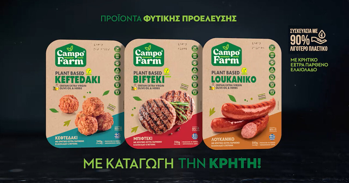 Τα Campo Farm, η νέα σειρά φυτικών προϊόντων, αποτελούνται από 100% φυτική πρωτεΐνη, με εξαιρετικό παρθένο κρητικό ελαιόλαδο, βότανα της Κρήτης και μεσογειακά μπαχαρικά, χωρίς ΣΥΝΤΗΡΗΤΙΚΑ, είναι PALM OIL FREE, GMO FREE, GLUTEN FREE, LACTOSE FREE, είναι πλούσια σε φυτικές ίνες , παράγονται δε με μειωμένο περιβαλλοντικό αποτύπωμα . Aπευθύνονται σε καταναλωτές που ακολουθούν plant-based ή flexiterian μοντέλο διατροφής.