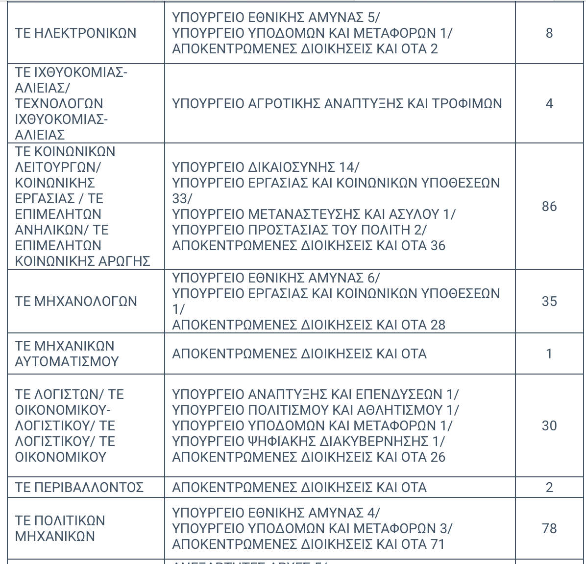 Στους παρακάτω πίνακες αναφέρονται ανά υπουργείο, ανά κλάδο και ανά ειδικότητα η κατανομή των θέσεων αυτών. Επισημαίνεται ότι στις θέσεις ανά Υπουργείο περιλαμβάνονται συγκεντρωτικά όλες οι θέσεις στην Κεντρική Υπηρεσία, τις Γενικές και Ειδικές Γραμματείες, τις αποκεντρωμένες – περιφερειακές υπηρεσίες καθώς και τα ΝΠΔΔ και ΝΠΙΔ που είναι υπό την εποπτεία του κάθε Υπουργείου. Συγκεντρωτικά επίσης αποτυπώνονται και οι θέσεις στις ανεξάρτητες αρχές και στις Αποκεντρωμένες Διοικήσεις και τους ΟΤΑ α΄ και β΄ βαθμού.