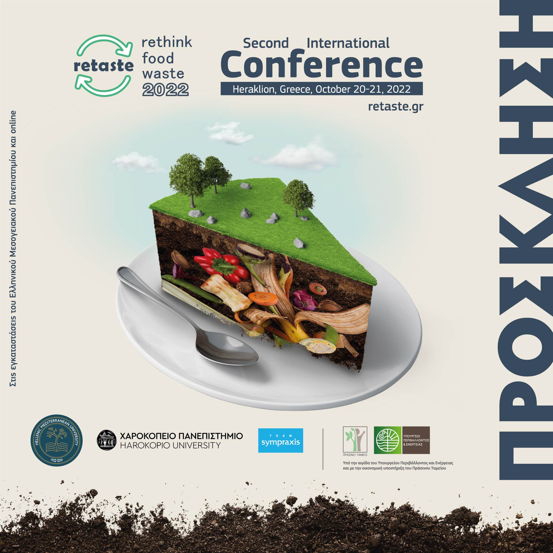 Το Ελληνικό Μεσογειακό Πανεπιστήμιο, σε συνεργασία με το Χαροκόπειο Πανεπιστήμιο, την υποστήριξη του Πράσινου Ταμείου και έχοντας την αιγίδα του Υπουργείου Περιβάλλοντος και Ενέργειας, διοργανώνουν το διήμερο διεθνές υβριδικό συνέδριο RETASTE 2022, με κύριο αντικείμενο τη διαχείριση των υπολειμμάτων τροφίμων και γενικότερα των οργανικών υπολειμμάτων και αποβλήτων.