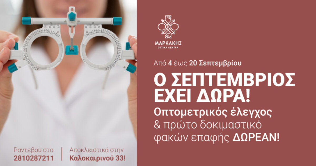 Η δράση που έχει ήδη ξεκινήσει στα Οπτικά Κέντρα Μαρκάκης περιλαμβάνει δωρεάν οπτομετρικό έλεγχο για όλους, καθώς και πρώτη δοκιμή φακών επαφής.