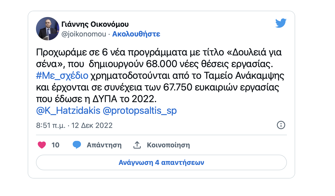 «Προχωράμε σε 6 νέα προγράμματα με τίτλο "Δουλειά για σένα", που δημιουργούν 68.000 νέες θέσεις εργασίας», αναφέρει σε ανάρτησή του ο κυβερνητικός εκπρόσωπος, Γιάννης Οικονόμου.
