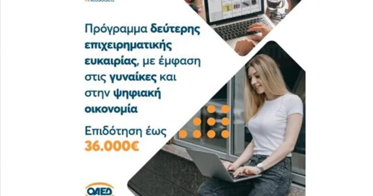 Μέχρι τις 4 Νοεμβρίου και ώρα 15:00 έχουν την ευκαιρία οι πολίτες να καταθέτουν αιτήσεις για το πρόγραμμα δεύτερης επιχειρηματικής ευκαιρίας, με έμφαση στις γυναίκες και στην ψηφιακή οικονομία με επιδότηση έως 36.000 ευρώ.