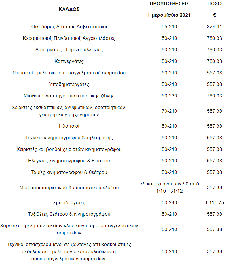 Δικαιούχοι είναι εργαζόμενοι ασφαλισμένοι στον e-ΕΦΚΑ που ασκούν ένα από τα παρακάτω επαγγέλματα: Οικοδόμου, λατόμου, ασβεστοποιού, κεραμοποιού, πλινθοποιού, αγγειοπλάστη, δασεργάτη, ρητινοσυλλέκτη, καπνεργάτη, μουσικού - μέλους οικείου επαγγελματικού σωματείου, υποδηματεργάτη, μισθωτού ναυπηγοεπισκευαστικής ζώνης, χειριστή εκσκαπτικών, ανυψωτικών, οδοποιητικών, γεωτρητικών μηχανημάτων, ηθοποιού, τεχνικού κινηματογράφου και τηλεόρασης, χειριστή και βοηθού χειριστή κινηματογράφου, ελεγκτή κινηματογράφου και θεάτρου, ταμία κινηματογράφου και θεάτρου, μισθωτού τουριστικού και επισιτιστικού κλάδου, σμυριδεργάτη, ταξιθέτου θεάτρου - κινηματογράφου, χορευτή - μέλους οικείων κλαδικών ή ομοιοεπαγγελματικών σωματείων, καθώς και του τεχνικού απασχολούμενου σε ζωντανές οπτικοακουστικές εκδηλώσεις - μέλους οικείων κλαδικών ή ομοιοεπαγγελματικών σωματείων.