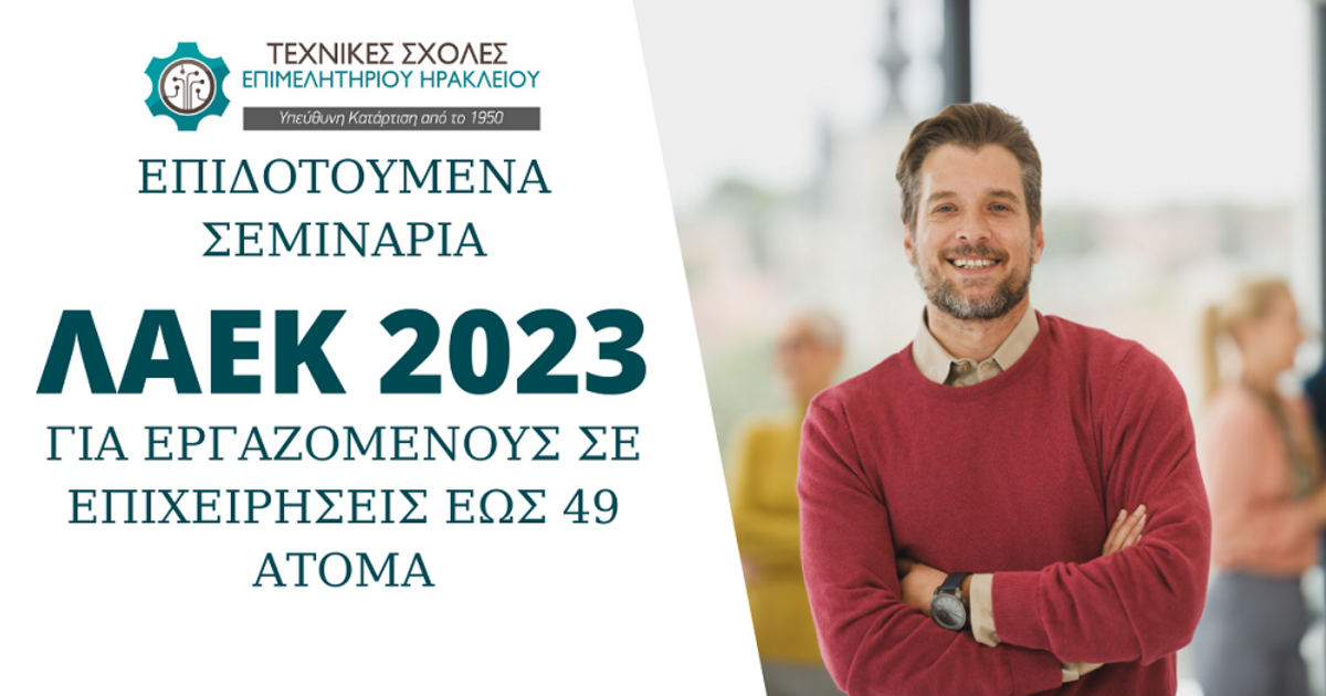 Το Επιμελητήριο Ηρακλείου, σε συνεργασία με τις Τεχνικές Σχολές Επιμελητηρίου Ηρακλείου, πρόκειται να υλοποιήσει επιδοτούμενα προγράμματα Επαγγελματικής Κατάρτισης Εργαζομένων σε Μικρές Επιχειρήσεις (ΛΑΕΚ 1-49 του ΟΑΕΔ έτους 2023). Οι καταρτιζόμενοι θα εκπαιδευτούν δωρεάν και επιπλέον θα επιδοτηθούν με 5€ ανά ώρα κατάρτισης (σύνολο 200 ευρώ για 40 ώρες μαθήματος).