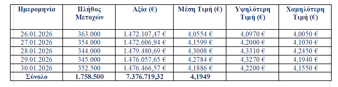 Στην αγορά 1.758.500 ιδίων μετοχών της που διαπραγματεύονται στο Χρηματιστήριο Αθηνών με μέση τιμή κτήσης 4,1949 ευρώ ανά μετοχή και συνολικό κόστος 7.376.719,32 ευρώ κατά το διάστημα 26.01.2026 – 30.01.2026 προχώρησε η Eurobank.