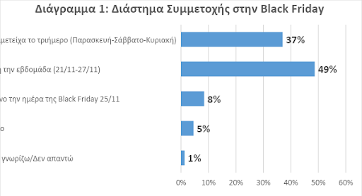 - Οι μισές (49%) επιχειρήσεις πραγματοποίησαν εκπτώσεις σε όλη τη διάρκεια της εβδομάδας, μετατρέποντας ουσιαστικά την «Black Friday» σε «Black Week» (Διάγραμμα 1).