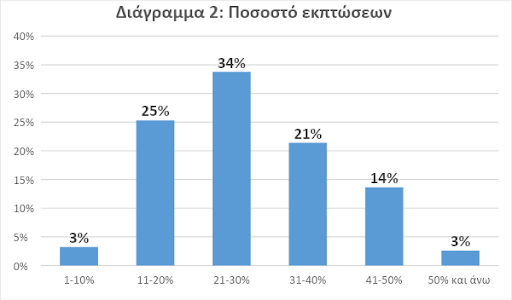 - Σχεδόν 2 στις 3 επιχειρήσεις (62%) υιοθέτησαν εκπτώσεις έως 30%, ενώ για 1 στις 3 επιχειρήσεις (34%) το ποσοστό εκπτώσεων κυμάνθηκε μεταξύ 21% και 30%.