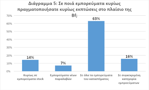 - Σχεδόν 2 στις 3 επιχειρήσεις προχώρησαν σε γενικευμένες εκπτώσεις, σε όλα δηλαδή τα εμπορεύματα, σε αντίθεση με αρκετές αλυσίδες και διαδικτυακά καταστήματα τα οποία υιοθέτησαν επιλεκτικές εκπτώσεις, σε συγκεκριμένες κατηγορίες/ εύρος προϊόντων (Διάγραμμα 5).