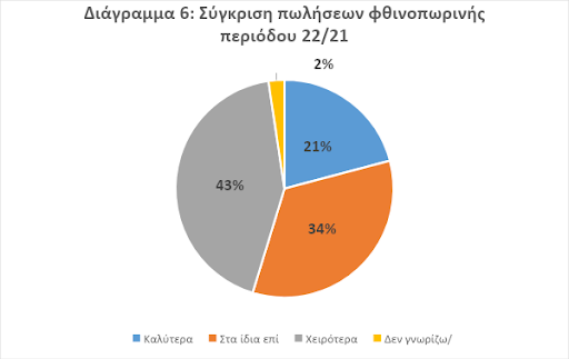 - Μία (1) στις τρεις (3) επιχειρήσεις θεωρεί πως ο κύκλος εργασιών της το φθινόπωρο του 2022 διαμορφώθηκε στα ίδια επίπεδα σε σχέση με το 2021 (Διάγραμμα 6). Ωστόσο, σημαντικό ποσοστό κατέγραψε επιδείνωση των πωλήσεων.