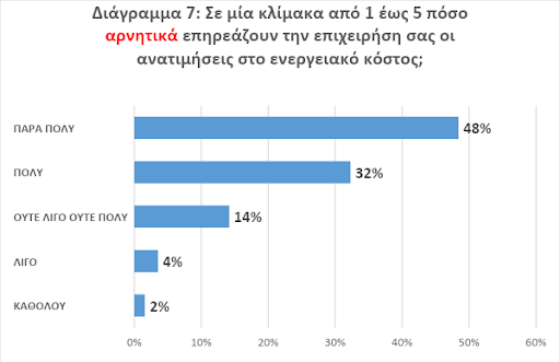 - Παρά το γεγονός ότι οι εμπορικές επιχειρήσεις δεν είναι έντασης ενέργειας, παρατηρείται σημαντική επιδείνωση στις αρνητικές επιπτώσεις (Διάγραμμα 7). Ειδικότερα, 8 στις 10 επιχειρήσεις δήλωσαν ότι επηρεάστηκαν πολύ/ πάρα πολύ από τις ανατιμήσεις στις τιμές της ενέργειας, ενώ σε αντίστοιχη μέτρηση των θερινών εκπτώσεων, μόλις τρεις μήνες πριν, στον ίδιο υψηλό βαθμό είχαν επηρεαστεί 7 στις 10.