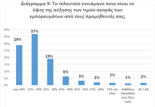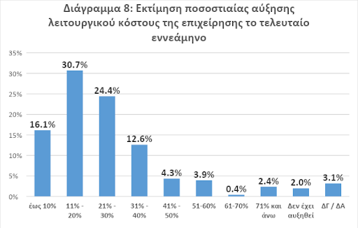 - Πιο συγκεκριμένα, σχεδόν οι μισές επιχειρήσεις καταγράφουν αυξήσεις στο λειτουργικό κόστους έως 20%, επιβάρυνση που θεωρείται χαμηλότερη συγκριτικά με άλλους κλάδους. Φυσικά, μια τέτοια επιβάρυνση, εν μέσω τέτοιας έντονης αβεβαιότητας και ρευστότητας, δεν μπορεί παρά να θεωρηθεί ότι αμφισβητεί τη βιωσιμότητα των επιχειρήσεων, παρά την κρατική υποστήριξη (Διάγραμμα 8).