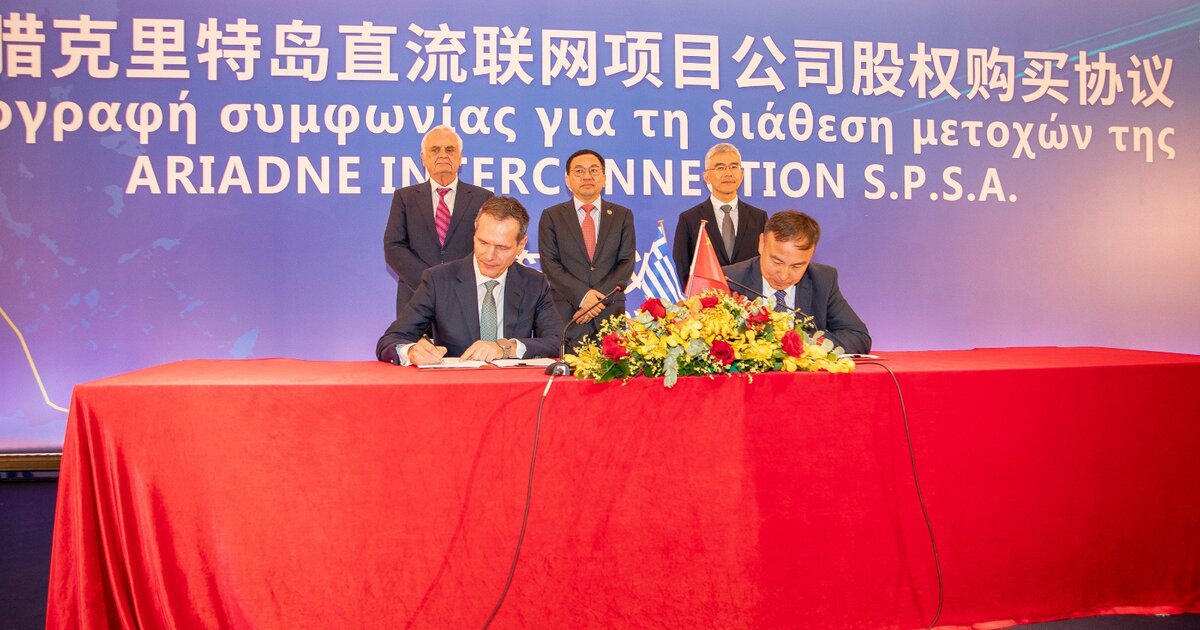 Τη συμφωνία για την διάθεση του 20% των μετοχών της θυγατρικής εταιρείας του ΑΔΜΗΕ και φορέα υλοποίησης της ηλεκτρικής διασύνδεσης Κρήτης-Αττικής, Ariadne Interconnection, στην State Grid International Development (SGID), υπέγραψαν ο Πρόεδρος και Διευθύνων Σύμβουλος του Διαχειριστή κ. Μάνος Μανουσάκης και ο Πρόεδρος της SGID κ. Yu Jun.