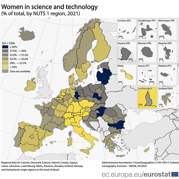 Για το 2021 η Λετονία και η Λιθουανία είναι οι δύο χώρες της Ευρωπαϊκής Ένωσης με περιφέρειες όπου οι γυναίκες εργαζόμενες στον χώρο της έρευνας και τεχνολογίας έχουν τα υψηλότερα ποσοστά εκπροσώπησης: 63%.