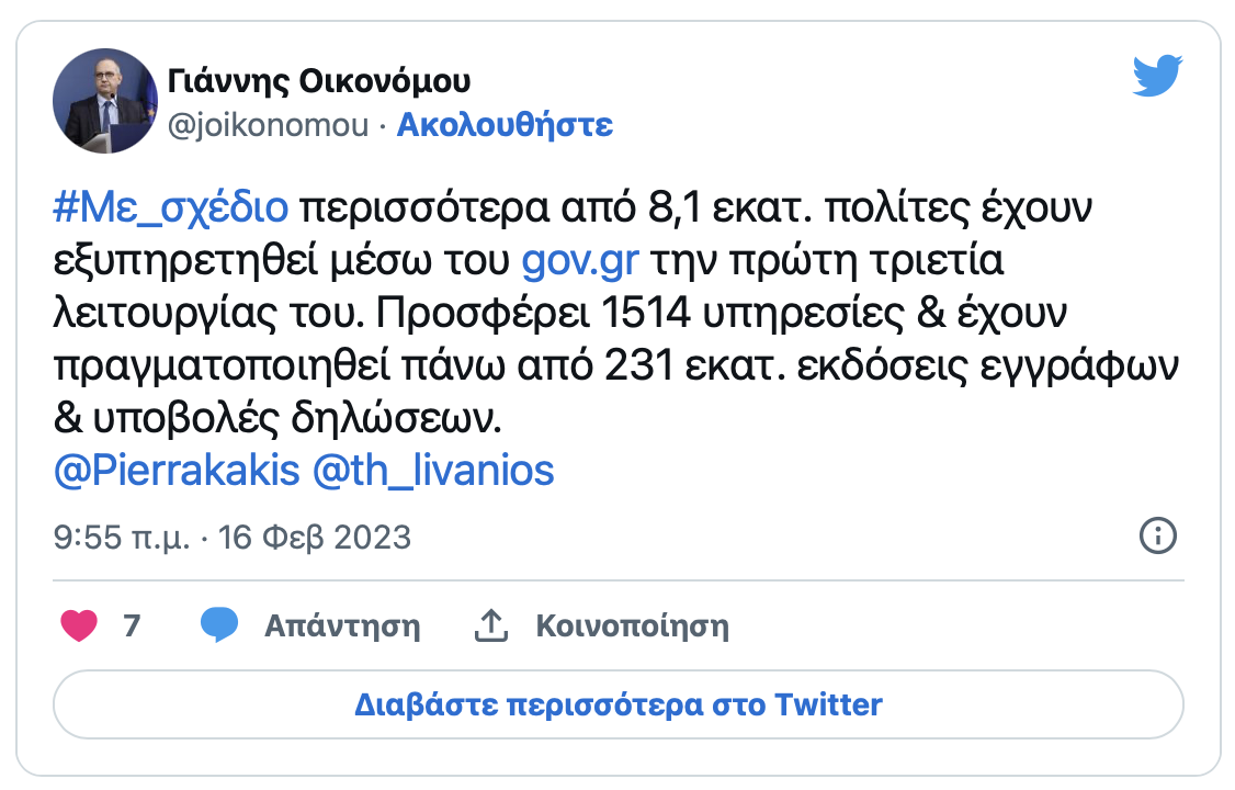 Συγκεκριμένα ο κ.Οικονόμου αναφέρει στην ανάρτηση του: «Με σχέδιο περισσότερα από 8,1 εκατ. πολίτες έχουν εξυπηρετηθεί μέσω του http://gov.gr την πρώτη τριετία λειτουργίας του. Προσφέρει 1514 υπηρεσίες και έχουν πραγματοποιηθεί πάνω από 231 εκατ. εκδόσεις εγγράφων και υποβολές δηλώσεων».