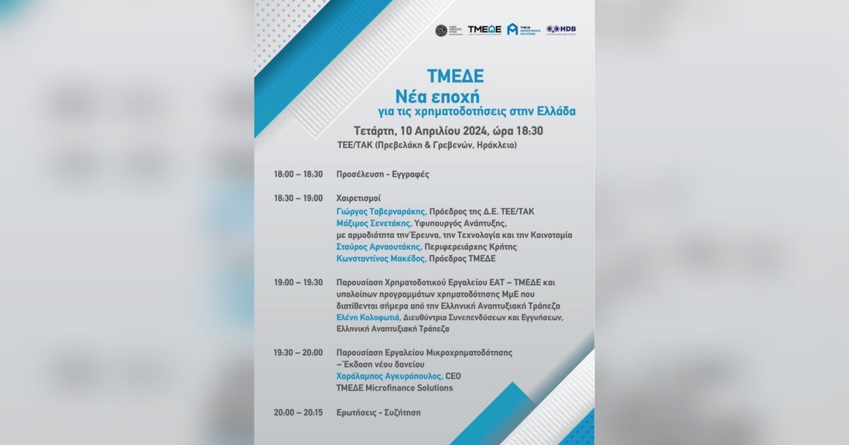 Μια ενδιαφέρουσα εκδήλωση για τους επιχειρηματίες του νησιού μας πραγματοποιείται σήμερα στο Ηράκλειο από το Περιφερειακό Τμήμα Ανατολικής Κρήτης του ΤΕΕ, το ΤΜΕΔΕ και την Ελληνική Αναπτυξιακή Τράπεζα στο ΤΕΕ/ΤΑΚ (Πρεβελάκη & Γρεβενών) στην οποία οι ομιλητές θα παρουσιάσουν το Χρηματοδοτικό Εργαλείο ΕΑΤ-ΤΜΕΔΑ, τα υπόλοιπα προγράμματα χρηματοδότησης ΜμΕ της Ελληνικής Αναπτυξιακής Τράπεζας, αλλά και το νέο εργαλείο Μικροχρηματοδότησης για την έκδοση νέου δανείου από την ΤΜΕΔΕ Microfinance Solutions.