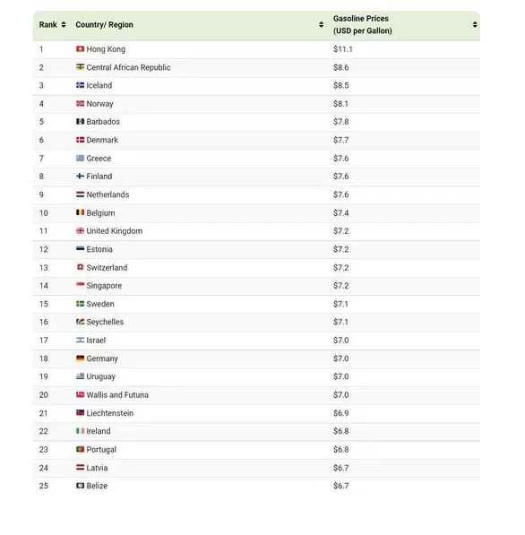 Με μέσο όρο 11,10 δολάρια ανά γαλόνι, τα νοικοκυριά στο Χονγκ Κονγκ πληρώνουν τα υψηλότερα επίπεδα βενζίνης στον κόσμο – υπερδιπλάσια από τον παγκόσμιο μέσο όρο. Τόσο οι υψηλοί φόροι φυσικού αερίου όσο και το υψηλό κόστος γης είναι πρωταρχικοί παράγοντες πίσω από τις υψηλές τιμές του φυσικού αερίου.