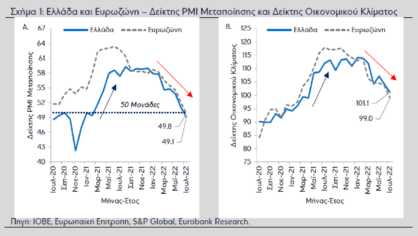 H κάμψη των δεικτών υψηλής συχνότητας της ελληνικής οικονομίας, με εξαίρεση την πορεία της απασχόλησης, αποτελούν ένα πρώτο καμπανάκι για την πορεία της εγχώριας οικονομικής δραστηριότητας τα επόμενα τρίμηνα, σύμφωνα με τον δείκτη PMI μεταποίησης της S&P Global και τον δείκτη οικονομικού κλίματος του ΙΟΒΕ, στοιχεία που επικαλείται η Eurobank Research στο πρόσφατο «7 Ημέρες Οικονομία» για τον Ιούλιο 2022.