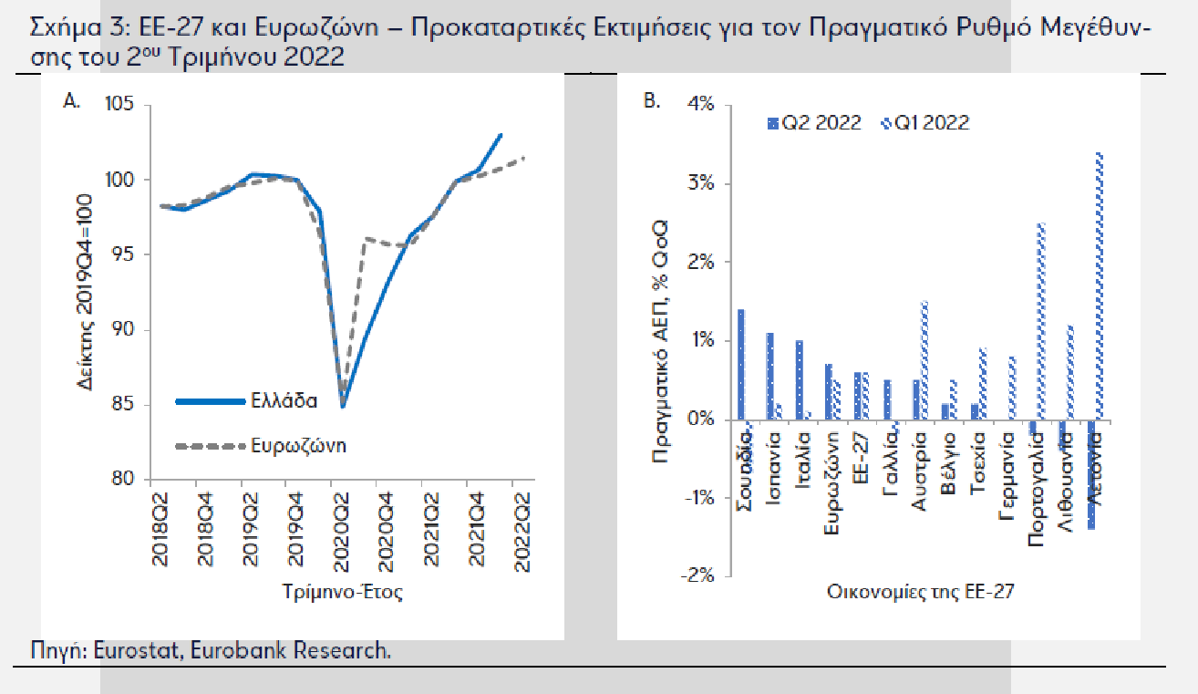 Υπογραμμίζεται ότ, οι τουριστικές εισπράξεις και τα μέτρα στήριξης της κυβέρνησης αναμένεται να αντισταθμίσουν σε έναν βαθμό τις ζημίες που δημιουργεί η ενεργειακή κρίση. Στην περίπτωση της Ευρωζώνης, τα αποτελέσματα του 2ου τριμήνου 2022, παρά την πτωτική πορεία των δεικτών PMI μεταποίησης και οικονομικού κλίματος, ήταν καλύτερα του αναμενομένου (0,7% QoQ / 4,0% YoY) κυρίως λόγω των υπηρεσιών, ειδικότερα αυτών που σχετίζονται με τον τουριστικό τομέα, που ευνόησαν ιδιαίτερα τις χώρες του ευρωπαϊκού νότου, κυρίως την Ισπανία (1,1% QoQ) και την Ιταλία (1,0% QoQ).