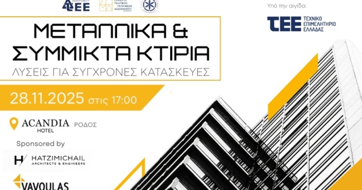 Οι εταιρείες VAVOULAS GROUP [turn key construction] και HATZIMICHAIL ARCHITECTS + ENGINEERS συμμετέχουν με εισηγήσεις στην εσπερίδα με τίτλο «Mεταλλικά & σύμμικτα κτίρια - Λύσεις για σύγχρονες κατασκευές», που πραγματοποιείται στην Ρόδο, την Παρασκευή 28 Νοεμβρίου 2025 - Ξενοδοχείο Acandia