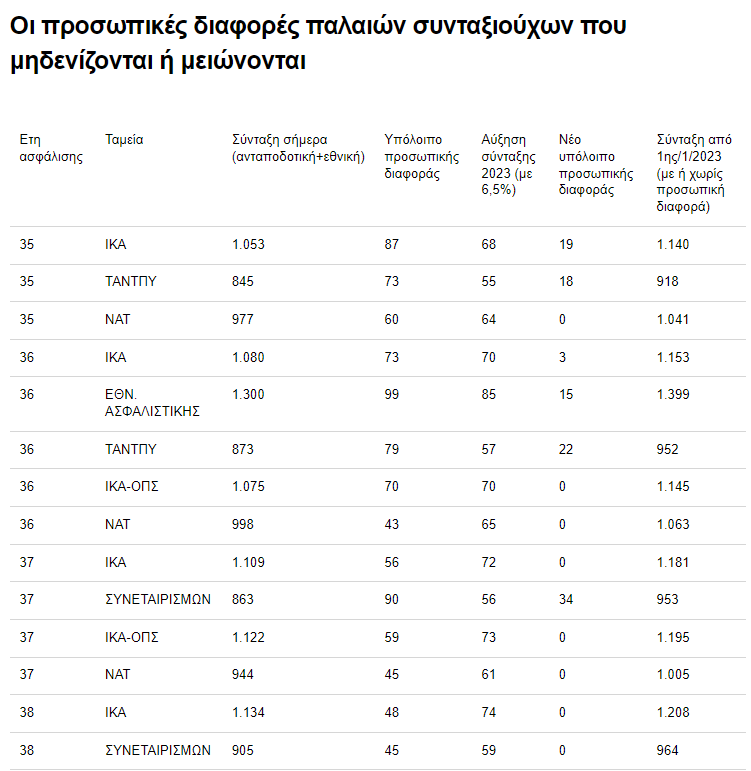 - Συνταξιούχος ΙΚΑ με 36 χρόνια ασφάλισης μετά τον επανυπολογισμό νόμου Βρούτση παίρνει 1.080 ευρώ ανταποδοτική και εθνική σύνταξη και υπόλοιπο προσωπικής διαφοράς 73 ευρώ. Με την αύξηση του 2023 η σύνταξη θα αυξηθεί κατά 70 ευρώ και θα έχει υπόλοιπο προσωπικής διαφοράς μόλις 3 ευρώ, που θα μηδενιστεί με την αύξηση του 2024.