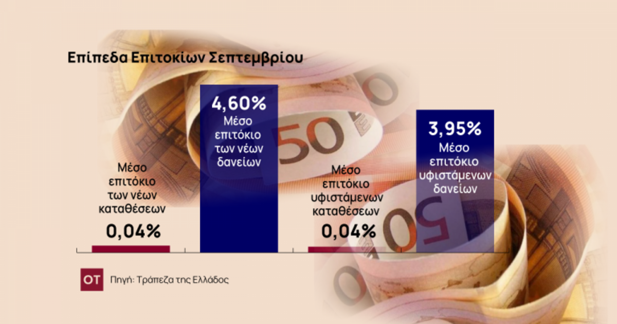 Πιο συγκεκριμένα, τον Σεπτέμβριο, και σύμφωνα με τα τελευταία στοιχεία της Τράπεζας της Ελλάδας, το μέσο επιτόκιο των νέων επιχειρηματικών δανείων με συγκεκριμένη διάρκεια και κυμαινόμενο επιτόκιο αυξήθηκε κατά 97 μονάδες βάσης, με αποτέλεσμα να διαμορφωθεί στο 3,97%. Προς μικρομεσαίες επιχειρήσεις (ΜΜΕ), το μέσο επιτόκιο των δανείων τακτής λήξης -με κυμαινόμενο επιτόκιο- αυξήθηκε κατά 66 μονάδες βάσης και ανέβηκε στο 4,17%.