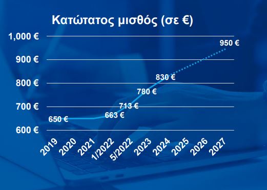 • Από 1/4/2024, ο κατώτατος μισθός έχει αυξηθεί στα 830 €, εμφανίζοντας αύξηση κατά 27,7%