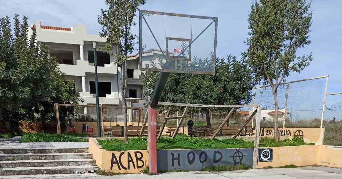 η παιδική χαρά στις Βασιλείες έχει αφεθεί στη μοίρα της. Σάπιες κούνιες, σπασμένα τζάμια, μπασκέτα χωρίς στεφάνι, μουντζούρες με σπρέι... και μια γενικότερη εικόνα παρακμής και εγκατάλειψης σε ένα προάστιο του Ηρακλείου.