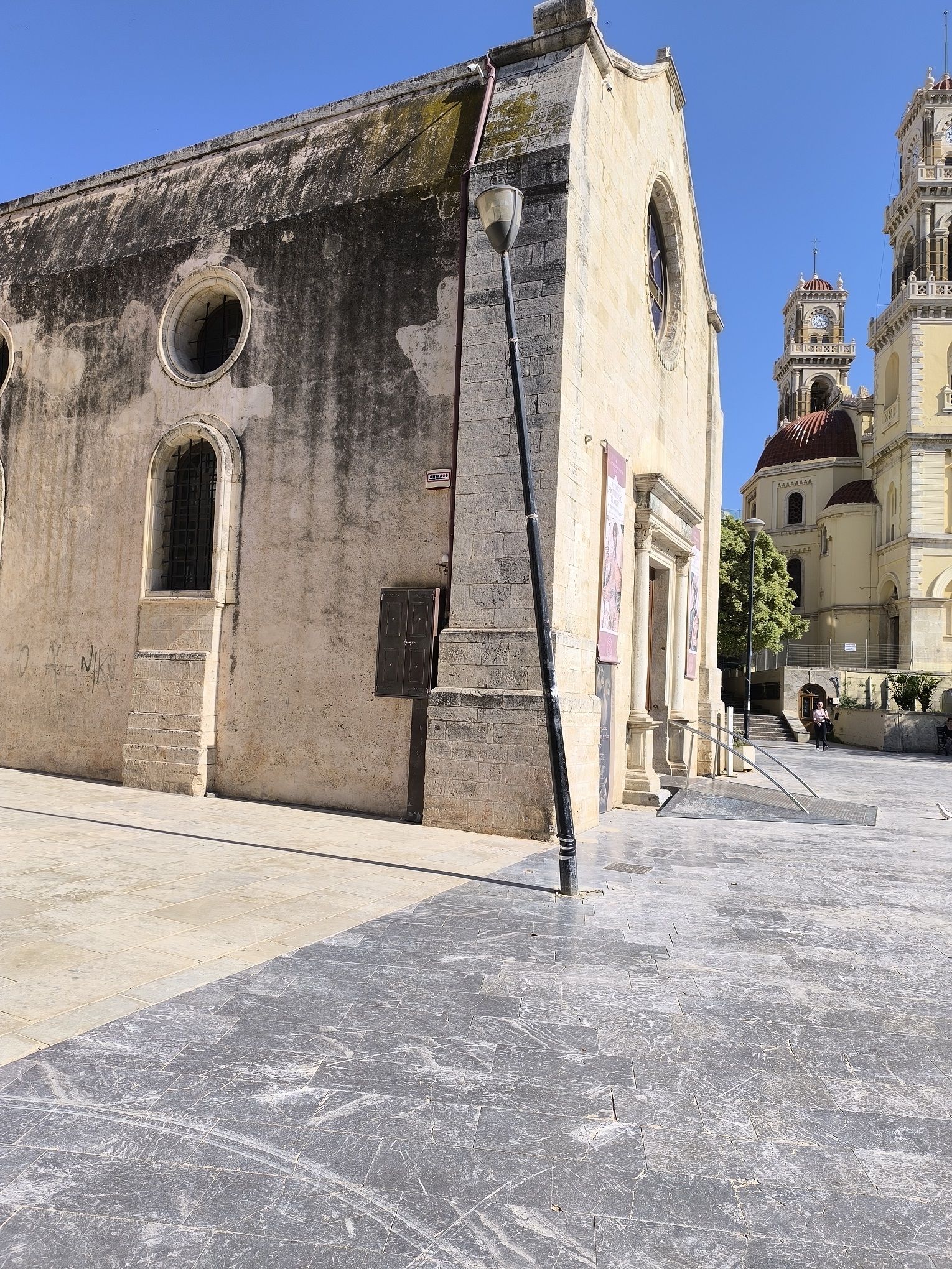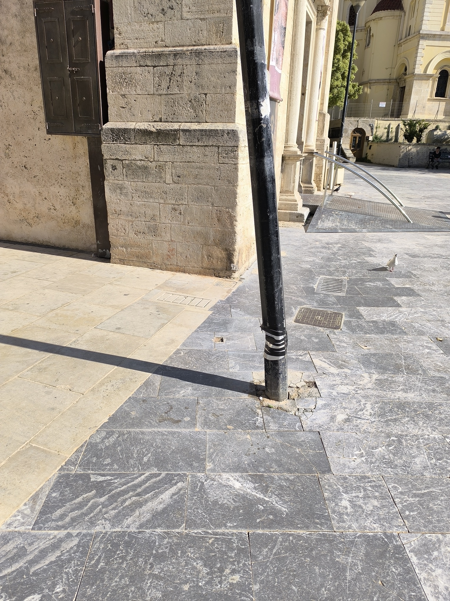 Μπορεί να μην έχει τα ... χρόνια του κεκλιμένου Πύργου της Πίζας, έχει πάρει όμως παρόμοια ... κλίση! Ο λόγος για στύλο φωτισμού στην πλατεία Αγίας Αικατερίνης που είναι μάλλον θέμα ... χρόνου, να πέσει σε κανένα κεφάλι παιδιού από τα πολλά που παίζουν καθημερινά στην πλατεία.