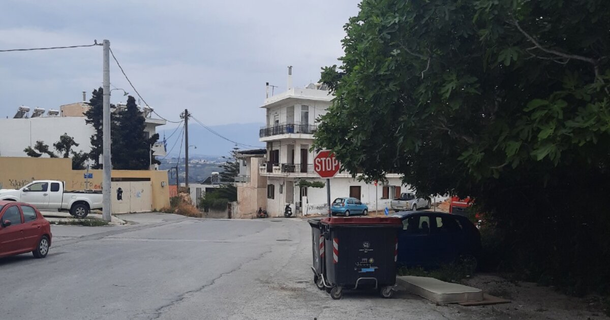 Πινακίδα STOP, στην μέση του δρόμου παρακαλώ, πίσω από τους κάδους σκουπιδιών και κάτω από μια συκιά που σε μια εβδομάδα θα την έχει καλύψει και δεν θα φαίνεται καθόλου .