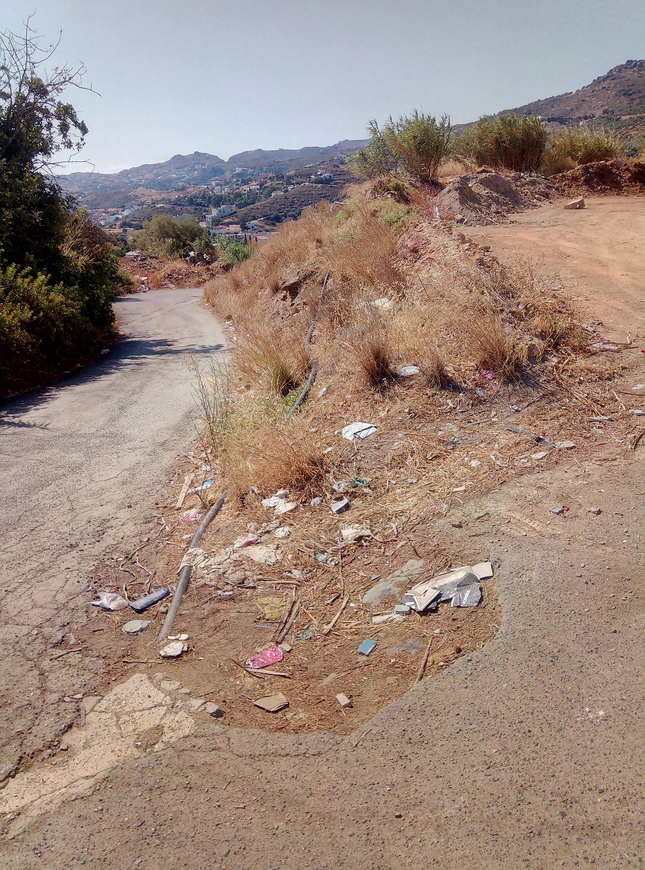 Σωροί μπαζών και σκουπιδιών που μένουν εκεί για μέρες με σχισμένες και τρύπιες σακούλες όπου στάζουν και τα ζουμιά κυλάνε στον δρόμο, κάθε λογής χαρτικά που τα παίρνει ο άνεμος και έχουν γεμίσει τα διπλανά χωράφια και τις άκρες του δρόμου, μύγες, δυσοσμία και όλα αυτά δίπλα σε κατοικίες, δίπλα στο μοναστήρι της Αγίας Πελαγίας του 13ου αι. που σε ένα παράλληλο σύμπαν ίσως και να αποτελούσε πόλο τουριστικής έλξης και το καλύτερο για το τέλος...δίπλα σε παντελώς άδειους κάδους.