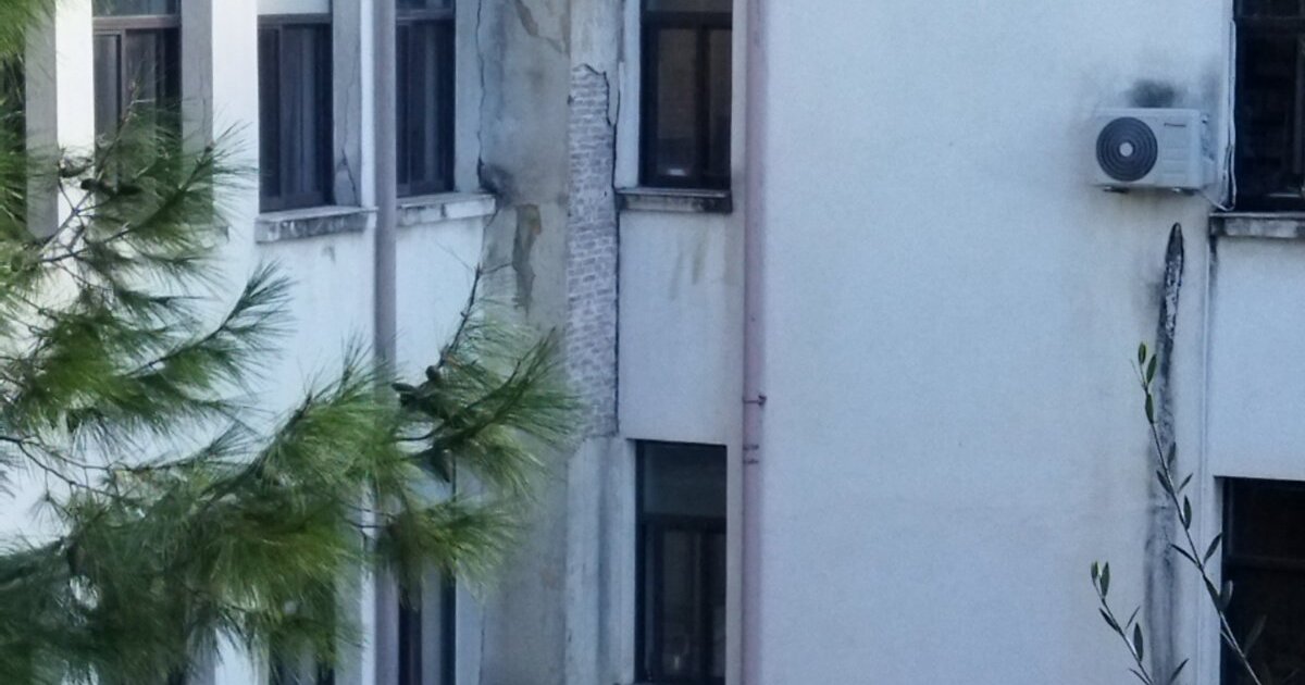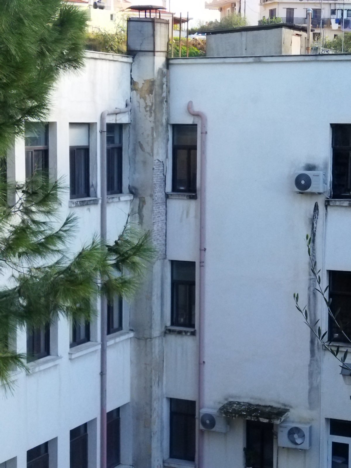Γενικό Νοσοκομείο Σάμου. Μετά το σεισμό της 30ης Οκτωβρίου 2020 η εικονιζόμενη καμινάδα είναι σ' αυτά τα χάλια δίχως να έχει γίνει κάποια παρέμβαση με αποτέλεσμα να υπάρχει κίνδυνος τραυματισμού.