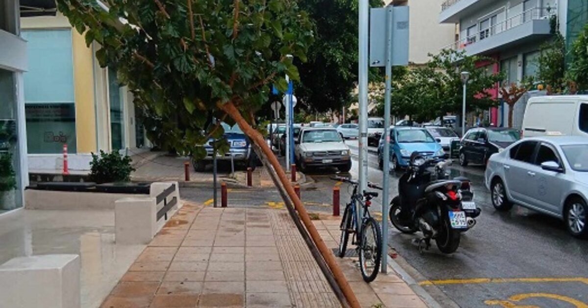 'Ενα μικρό δέντρο λύγισε νωρίτερα σήμερα κι έγειρε στην οδό Χρυσοστόμου, στο κέντρο του Ηρακλείου, προφανώς εξαιτίας των ισχυρών ανέμων που πνέουν τις τελευταίες ώρες.