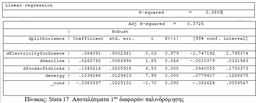 Επειδή τα δεδομένα ,δεν ήταν στάσιμα έπειτα από τους ελέγχους που έγιναν ,πήραμε τις 1ες διαφορές όλων των μεταβλητών .Στην παρακάτω εξίσωση τρέξαμε την παλινδρόμηση OLS ,με εξαρτημένη μεταβλητή τον πληθωρισμό και ανεξάρτητες ,τις μεταβολές του ηλεκτρικού ρεύματος ,της βενζίνης ,του αερίου και των τροφίμων -αναψυκτικών .