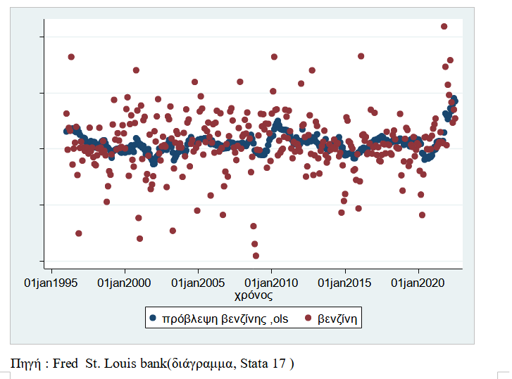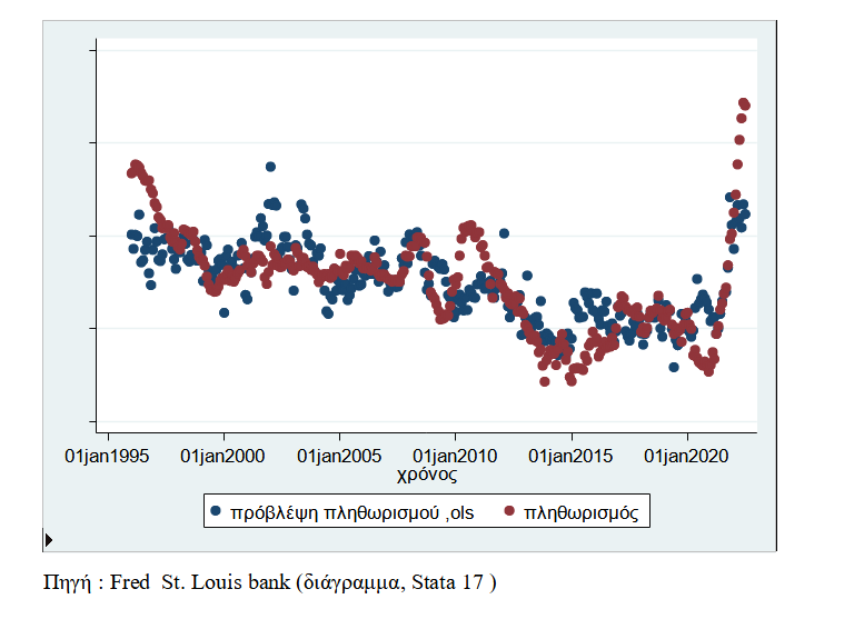 Μεταβολή του πληθωρισμού και της πρόβλεψης της παλινδρόμησης μέσα στο χρόνο. Φαίνεται πως τα τελευταία χρόνια η αύξηση του πληθωρισμού είναι πολύ πάνω από ότι έπρεπε .