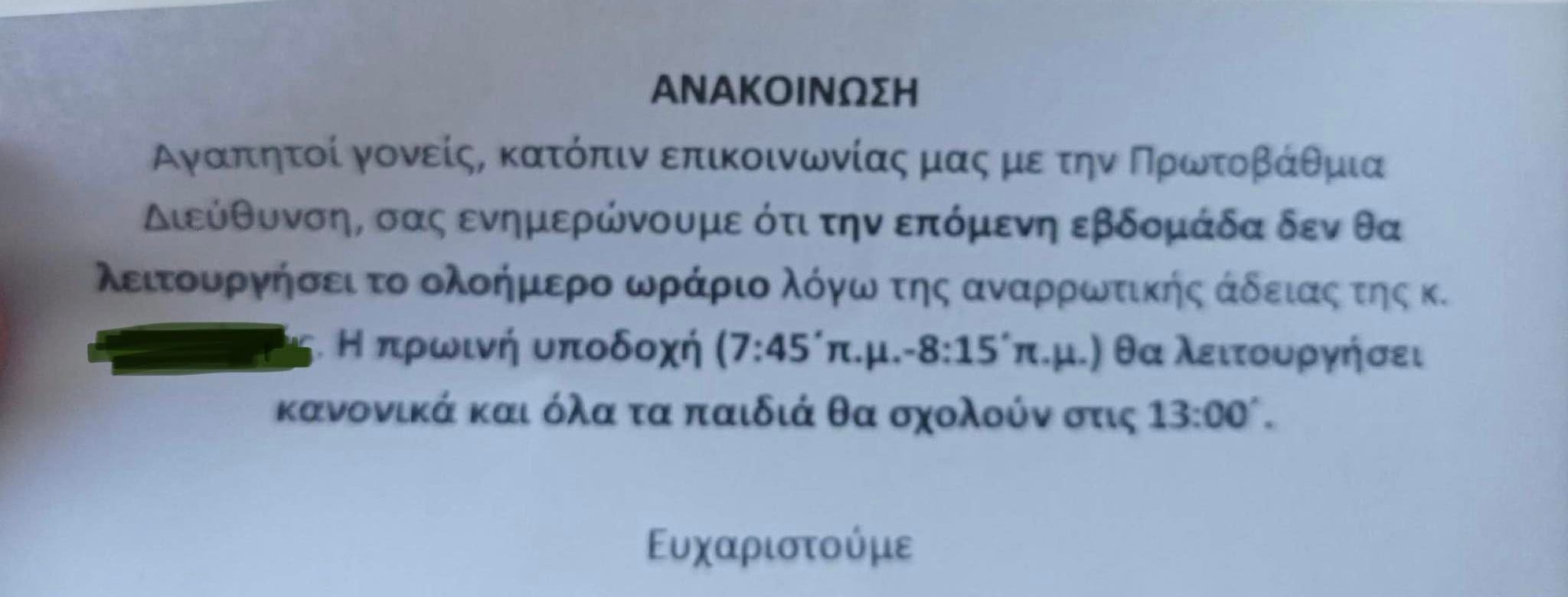 Οι γονείς των παιδιών του 8ου νηπιαγωγείου, λάβαμε σήμερα ένα ραβασάκι πως λόγω αναρρωτικής άδειας της νηπιαγωγού μας την επόμενη εβδομάδα δε θα λειτουργήσει το ολοήμερο ωράριο.