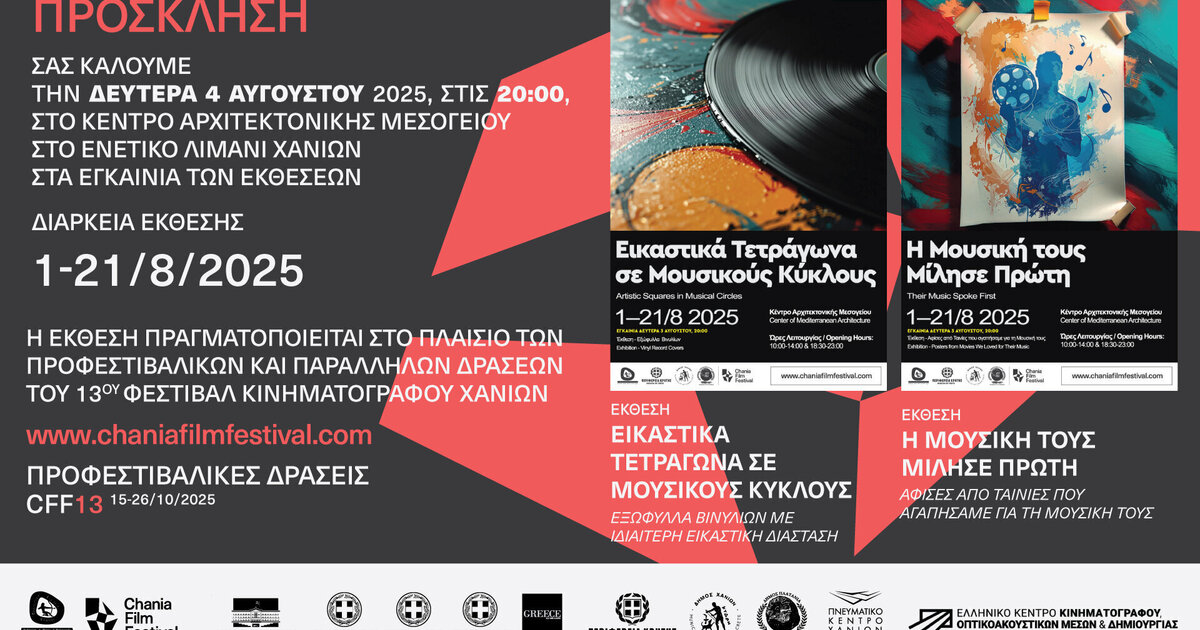 Το Φεστιβάλ Κινηματογράφου Χανίων σας προσκαλεί την Δευτέρα 4 Αυγούστου 2025 στις 8 το βράδυ στα εγκαίνια των καλοκαιρινών του εκθέσεων στο Κέντρο Αρχιτεκτονικής Μεσογείου στο Ενετικό Λιμάνι Χανίων.