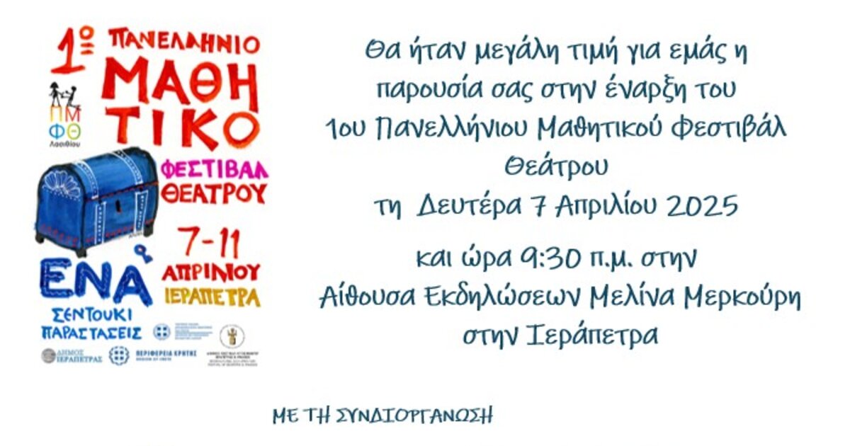 Με καίρια επιδίωξη την ενίσχυση της θεατρικής παιδείας των μαθητ(ρι)ών και την ανάδειξη του Θεάτρου ως μέσου για την πολιτιστική, πολιτική, κοινωνική, ηθικοπνευματική παίδευσή τους και την καλλιέργεια της ενεργούς πολιτειότητας, η Διεύθυνση Δευτεροβάθμιας Εκπαίδευσης Λασιθίου διοργανώνει το 1ο Πανελλήνιο Μαθητικό Φεστιβάλ Θεάτρου, σε συνεργασία με την Περιφέρεια Κρήτης - Περιφερειακή Ενότητα Λασιθίου, τον Δήμο Ιεράπετρας και το Διεθνές Φεστιβάλ Ντοκιμαντέρ Ιεράπετρας & Αwards και με την υποστήριξη και εθελοντική συμμετοχή του Κέντρου Εκπαίδευσης για το Περιβάλλον και την Αειφορία (Κ.Ε.ΠΕ.Α.) Ιεράπετρας-Νεάπολης, του Συλλόγου Φίλων Θεάτρου Ιεράπετρας και των σχολικών κοινοτήτων (εκπαιδευτικών, γονέων και μαθητών).