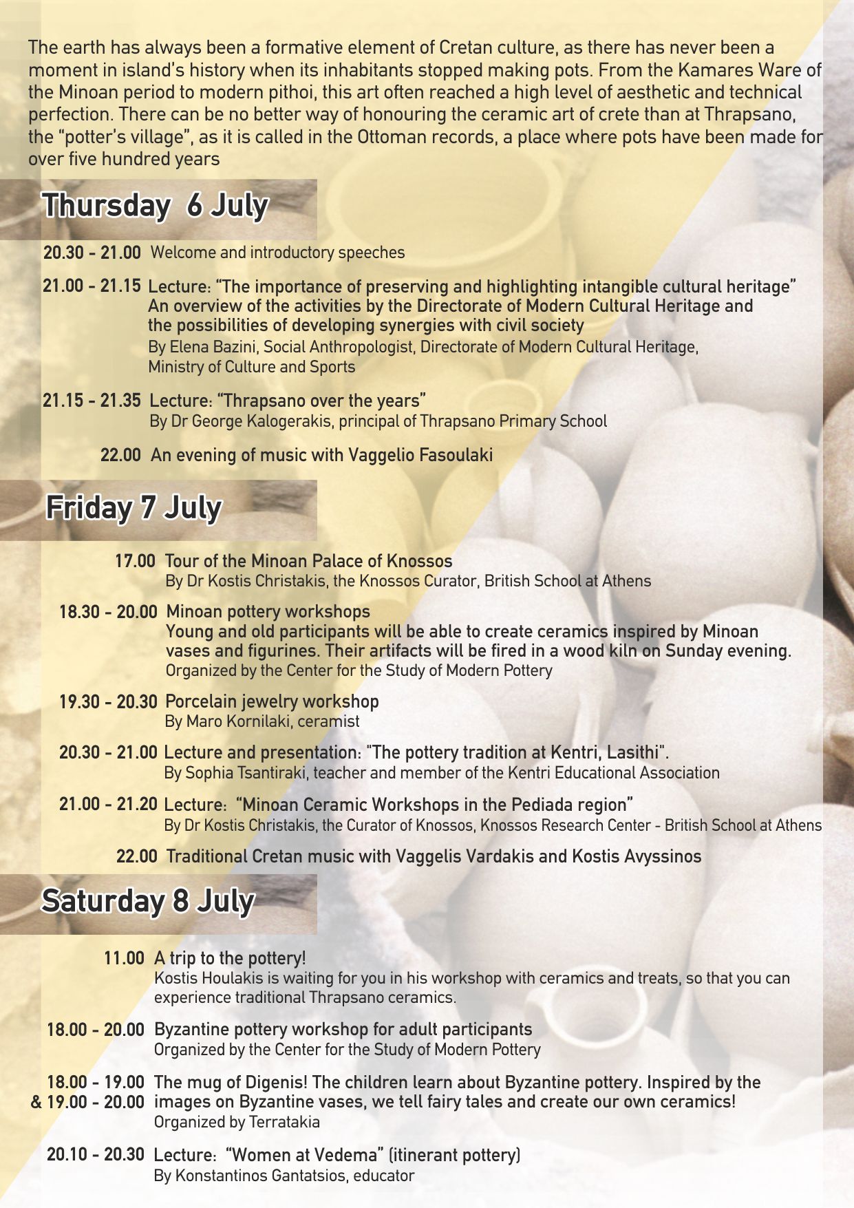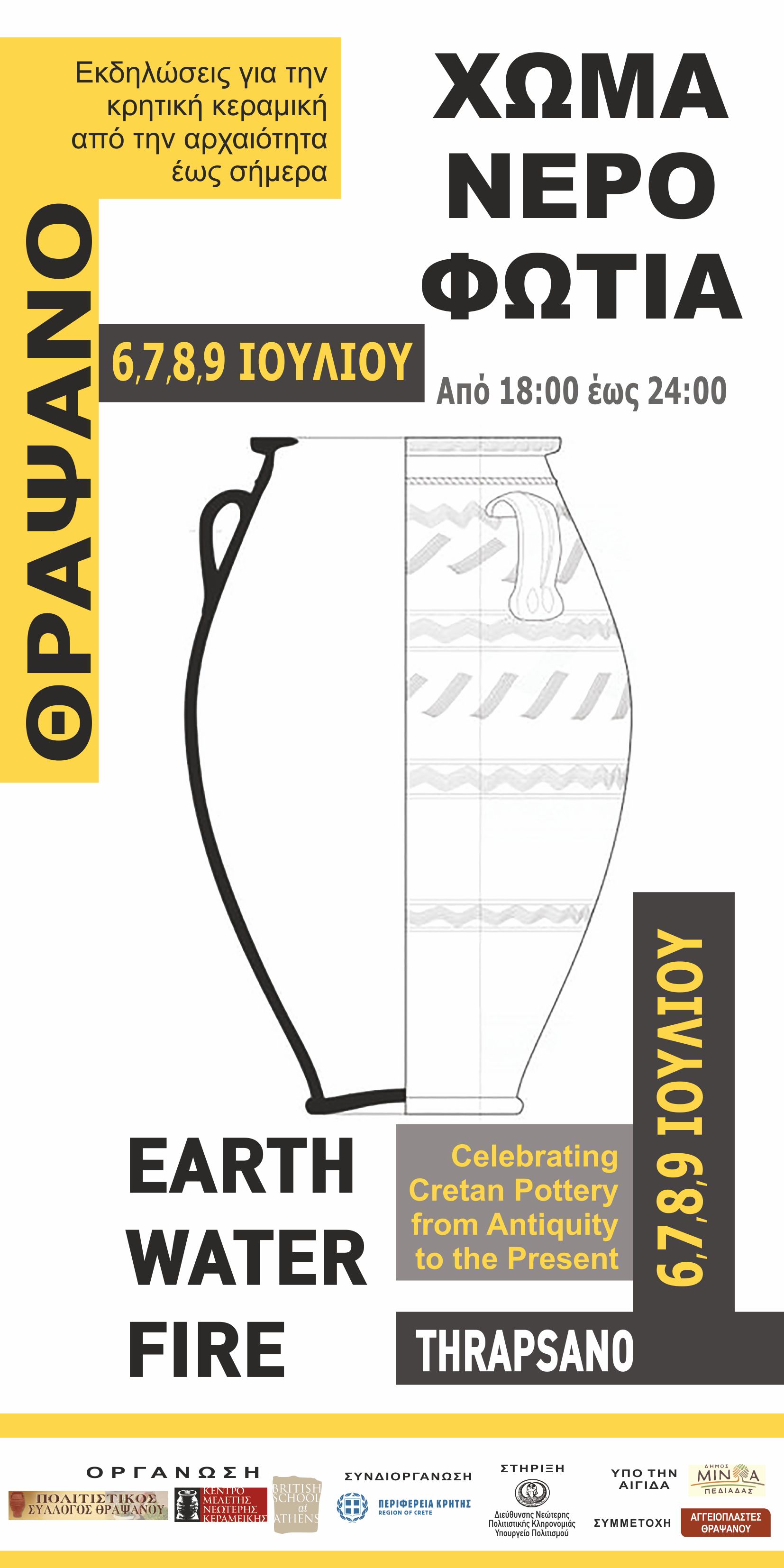 Ο Πολιτιστικός Σύλλογος Θραψανού η Βρετανική Σχολή Αθηνών, το Κέντρο Μελέτης Νεώτερης Κεραμεικής , με ΣΥΝΔΙΟΡΓΑΝΩΣΗ την ΠΕΡΙΦΕΡΕΙΑ ΚΡΗΤΗΣ την στήριξη του Υπουργείου Πολιτισμού των Αγγειοπλαστών του Θραψανού, διοργανώνει σειρά πολιτιστικών εκδηλώσεων εστιασμένων στην Κρητική παραδοσιακή κεραμική και τον πολιτισμό της Κρήτης. , υπό την αιγίδα του ΔΗΜΟΥ ΜΙΝΩΑ ΠΕΔΙΑΔΑΣ