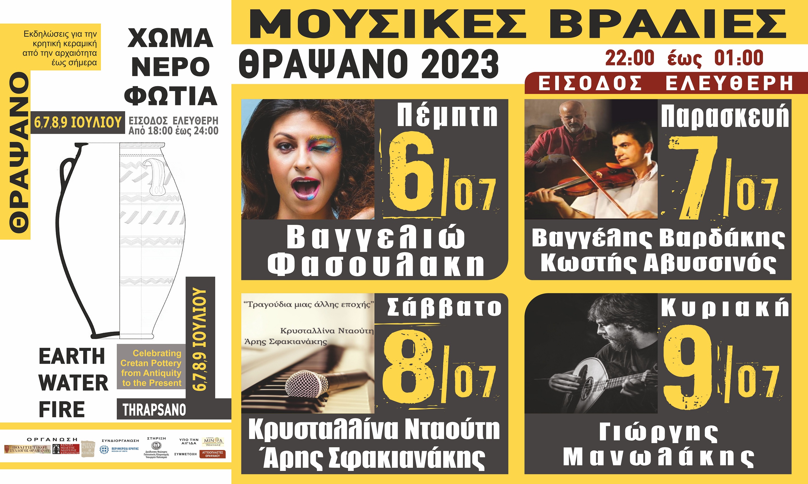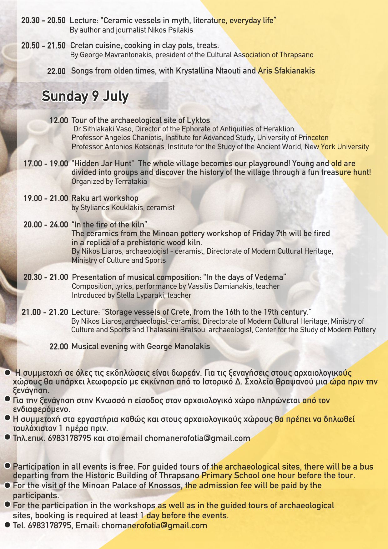 20.50 – 21.50 : Κρητική Κουζίνα, μαγειρική σε πήλινα σκεύη και κέρασμα απο τον Γίωργο Μαυραντωνάκη Πρόεδρο του Πολ. Συλλόγου Θραψανού.