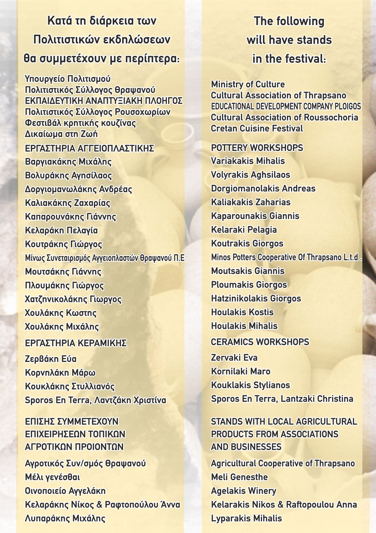 Στις φετινές εκδηλώσεις θα τιμηθούν τα Κέντρα Αγγειοπλαστικής Κρήτης, ΤΟ ΚΕΝΤΡΙ ΙΕΡΑΠΕΤΡΑΣ , ΚΑΙ ΟΙ ΜΑΡΓΑΡΙΤΕΣ ΡΕΘ. με περίπτερα και ειδικές Ανααφορές για την Ιστορία της κεραμικής-Αγγειοπλαστικής της Κρήτης.